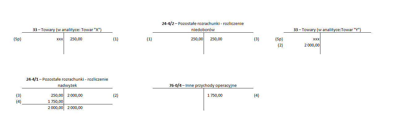 niedobór 5 sztuk towaru "X" (5 szt. × 50 zł) o wartości 250 zł,