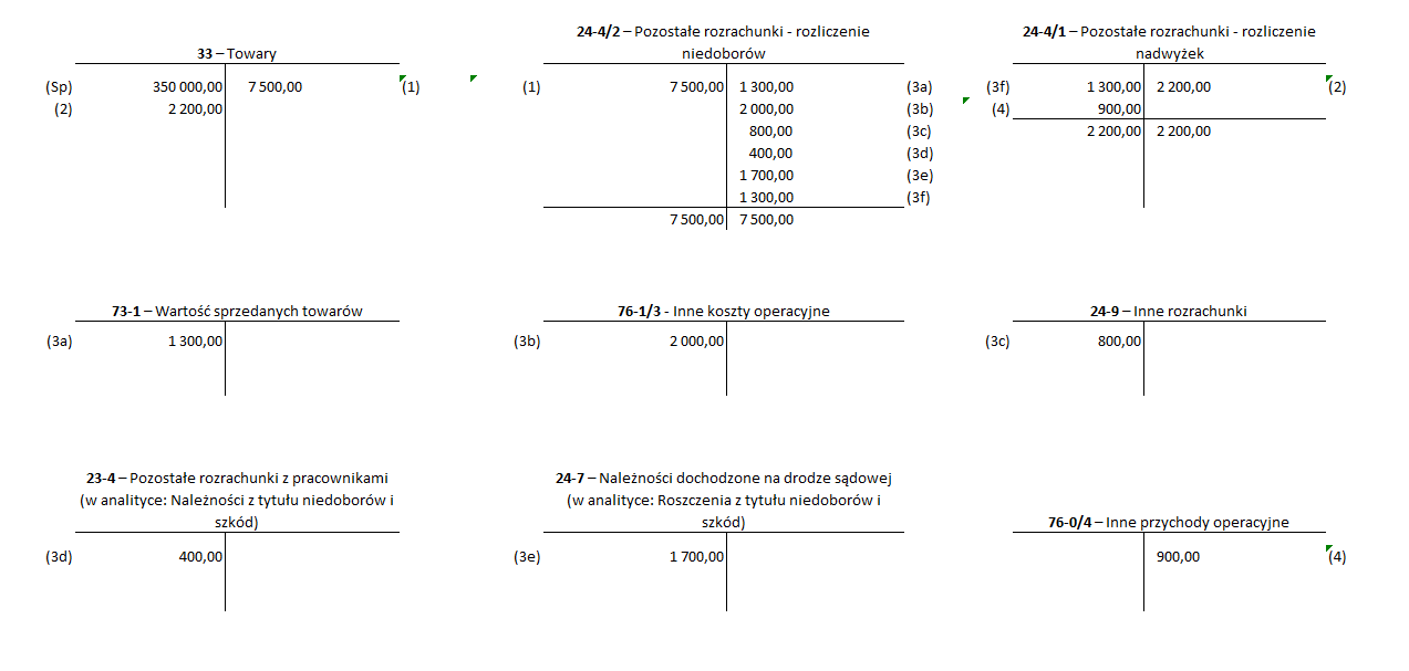 W wyniku inwentaryzacji w jednostce stwierdzono następujące niedobory i nadwyżki towarów ewidencjonowanych w cenach zakupu netto: