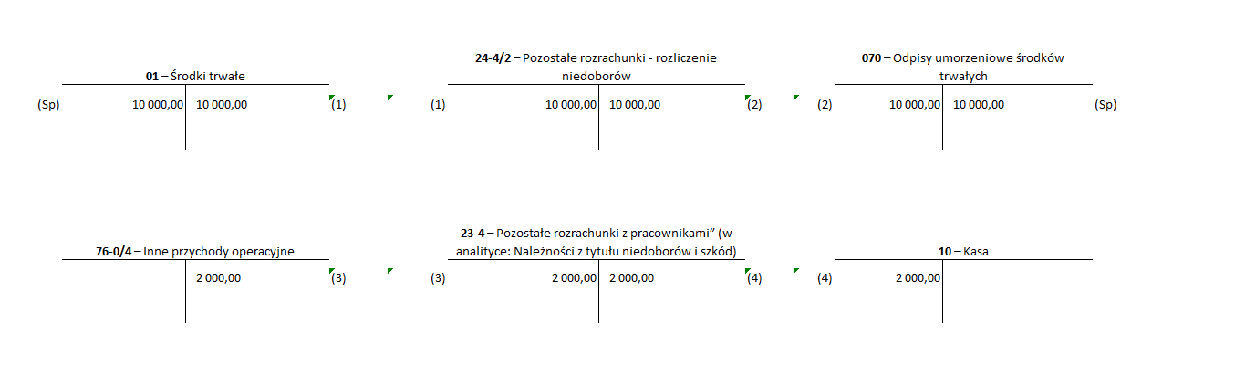 W wyniku inwentaryzacji stwierdzono niedobór środka trwałego w 100% umorzonego. Wartość początkowa tego środka trwałego wynosiła 10 000 zł. Niedobór został uznany za zawiniony z winy pracownika. Kierownik jednostki obciążył pracownika kwotą 2 000 zł. Kwotę roszczenia pracownik wpłacił do kasy jednostki.